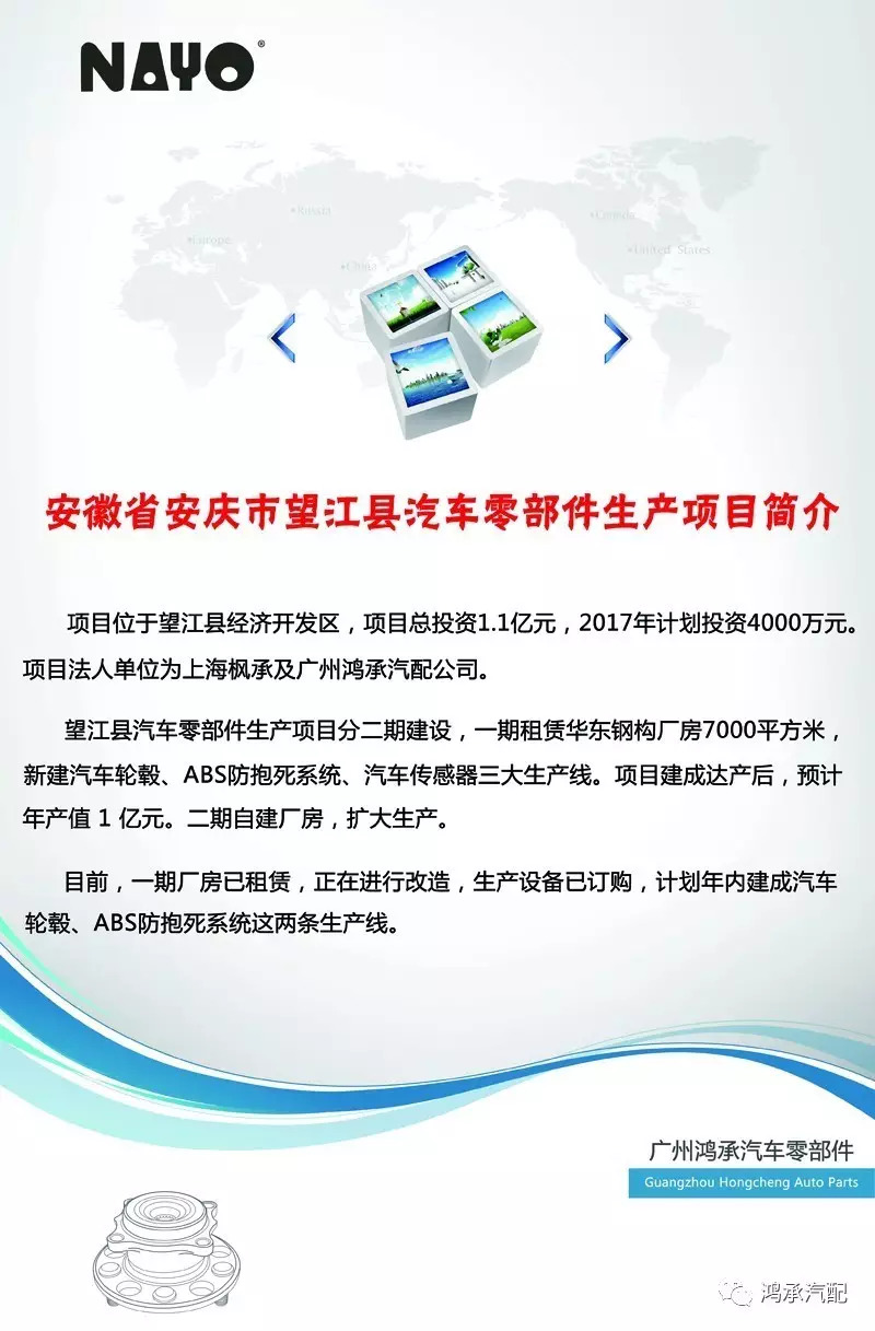 望江縣汽車零部件生產(chǎn)項(xiàng)目分二期建設(shè),一期租賃華東鋼構(gòu)廠房7000平方米,新建汽車輪轂、ABS防抱死系統(tǒng)、汽車傳感器三大生產(chǎn)線。項(xiàng)目建成達(dá)產(chǎn)后,預(yù)計(jì)年產(chǎn)值 1 億元。二期自建廠房,擴(kuò)大生產(chǎn)。